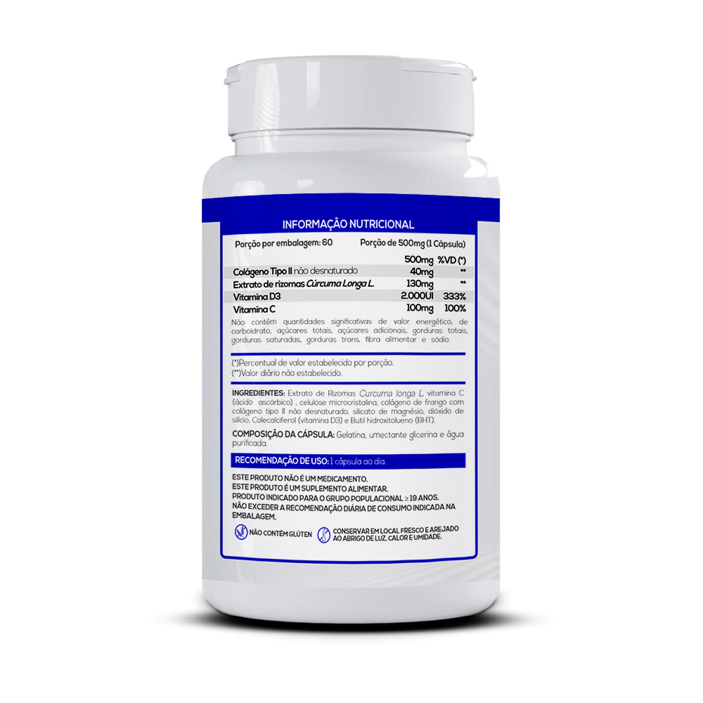 Com a união do Colágeno Tipo II, Cúrcuma, Vitamina D3 e Vitamina C, você conquista mais flexibilidade, menos inflamação e uma estrutura forte para encarar qualquer desafio do dia.