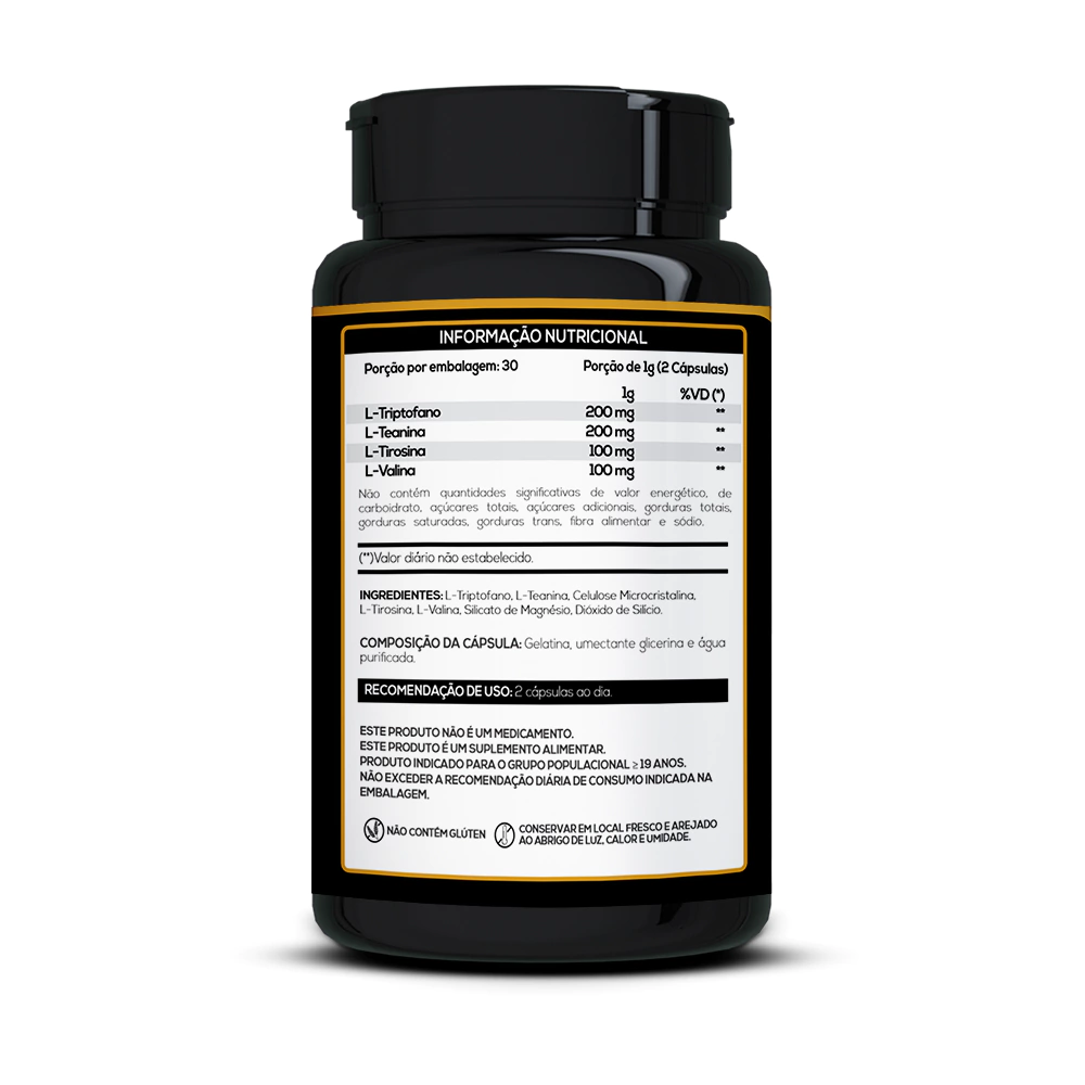L-Triptofano: precursor da serotonina, promove sensação de felicidade, reduz ansiedade e melhora a qualidade do sono ao estimular a produção de melatonina.